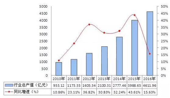 ? LED企業整體經營效益向好,源于LED產業產銷規模的穩定增長。數據顯示,2010-2016年,中國LED行業工業總產值呈逐年快速增長趨勢,2016年實現工業總產值4611.96億元,同比增長15.63%。